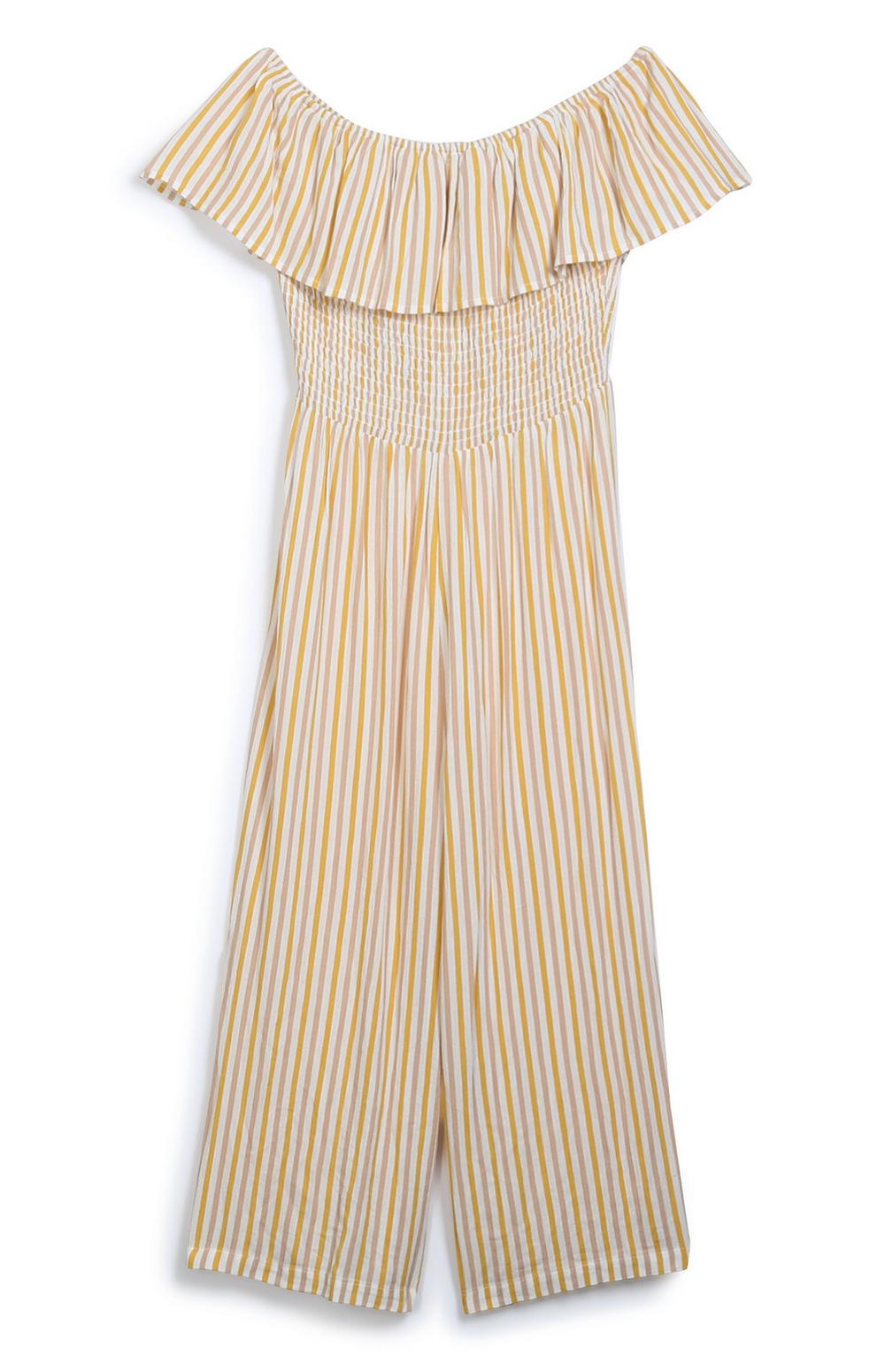 The yellow, white and pink striped piece has a bardot top with ruffles which makes it a little bit dressy in case you want to head for dinner or drinks.