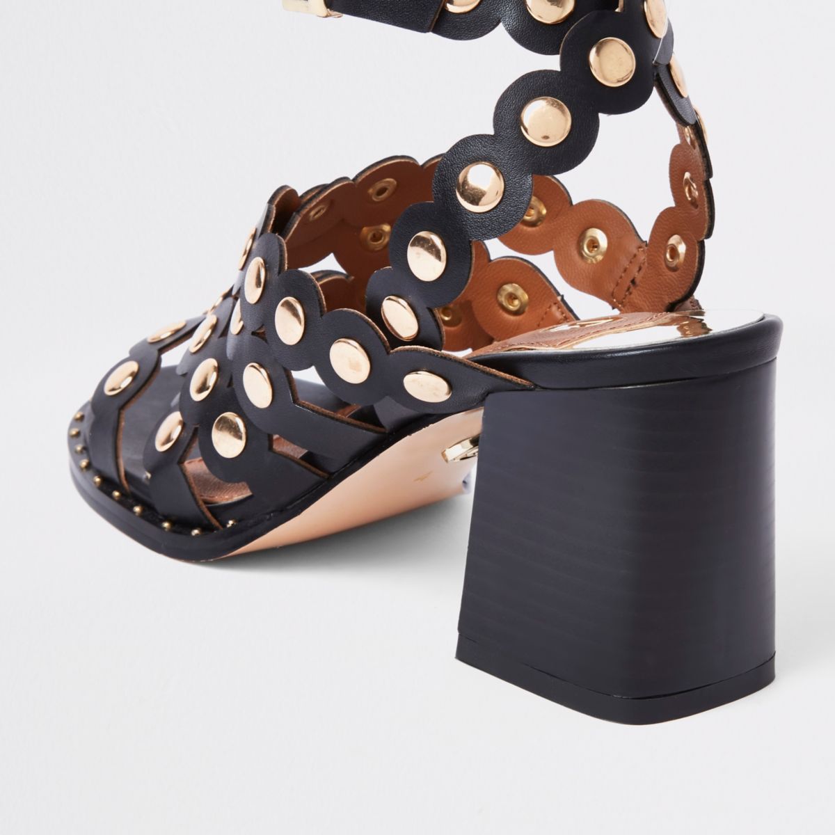 The scallop block heel has a small heel to give you a bit of height and has gold studs all around to give an extra bit of glam.