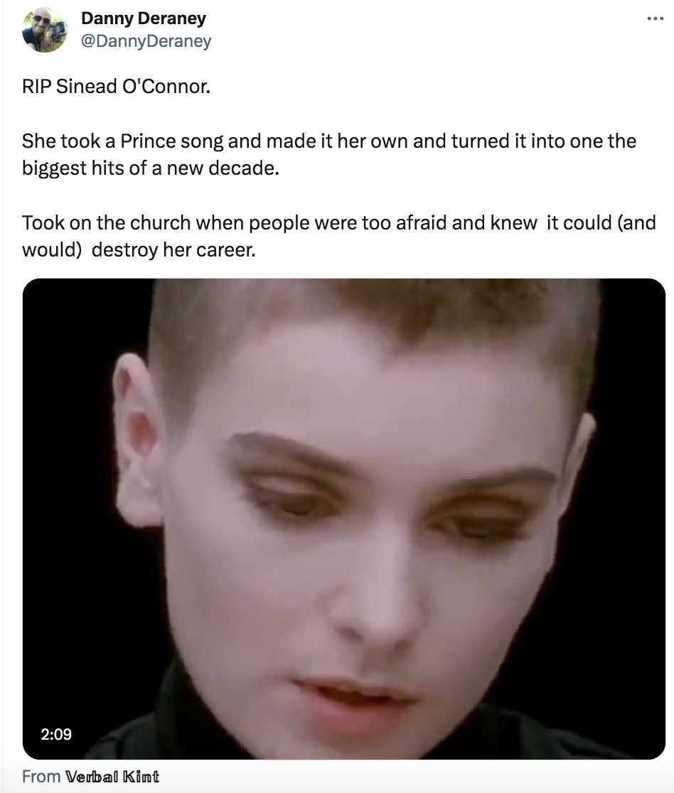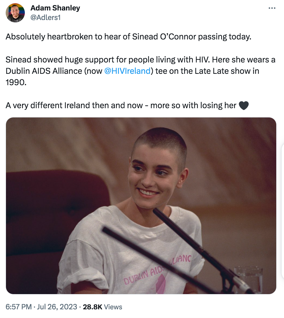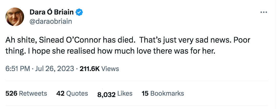 Heartbreaking tributes are pouring in as news breaks that Sinead O’Connor has passed away at the age of 56. The Dublin native had career spanning over three decades, with 10 studio albums and her single Nothing Compares 2 U was named the number one world single in 1990 by the Billboard Music Awards. 'Her music was loved around the world and her talent was unmatched and beyond compare,' said Taoiseach Leo Varadkar. https://twitter.com/LeoVaradkar/status/1684265008320872461 Among those to pay tribute were Dara O’Briain and Adam Shanley, both of whom expressed their sadness at the news on Twitter.
